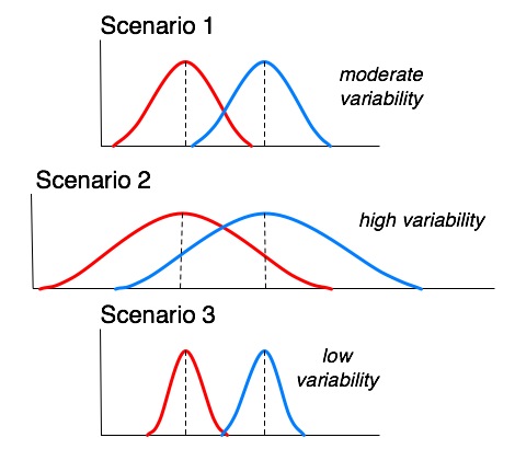 A T-test is how researchers determine if there is a Significant Difference between two sets of data. Take a look at the three graphs below…