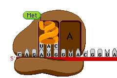 The mRNA passes through the Ribosome which reads the first codon. Where the Ribosome starts working is known as the Start Codon, or AUG, which codes for the Amino Acid Methionine. As the first codon is read, tRNA’s are moving to the Ribosome. tRNA’s carry an Amino Acid and an Anticodon, which is the compliment to the Codon. The Codon AUG, would need a tRNA with the Anticodon UAC to be added. As the tRNA bonds with the mRNA, the Ribosome slides down the mRNA to the next Codon and another tRNA is added that has the correct Anticodon.